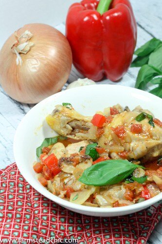Anyway, on with the recipe!  I tweaked the original recipe to add more veggies.  This Paleo & Whole30 Chicken Cacciatore recipe is a quick, simple, one-pot wonder but tastes divine with chicken that literally falls off the bone and veggies melded together in savory perfection.