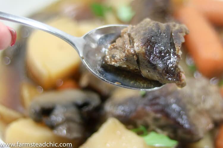 - Sprinkle beef stew meat generously on each side with sea salt and freshly ground black pepper. Brown meat in a large skillet on each side about 4-5 minutes per side. Use tongs to turn the meat but not until you can do so without it sticking. Brown it in two batches if necessary to keep the meat from touching.
