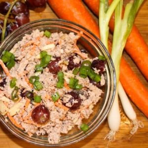 - Fold in the carrots, grapes and almonds, being careful not to smash the grapes while still mixing thoroughly.